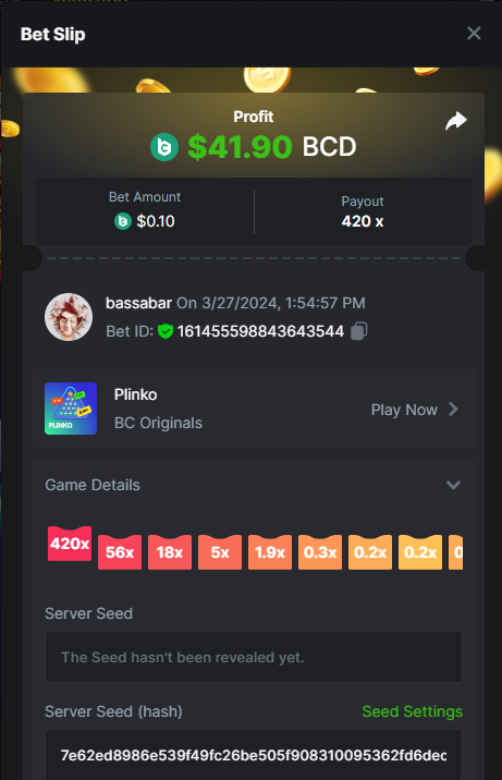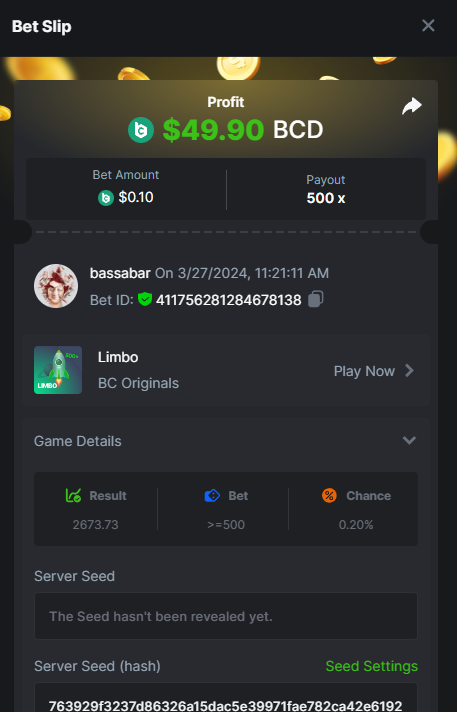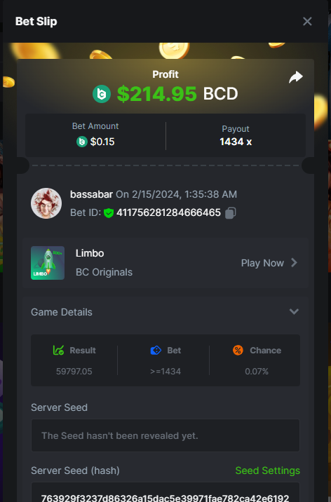 Highest multiplier: Deadliest Sea - 1950.6976x https://bc.game/#/sd/11TLGQLGWPG70N (Lower multies) Runaway! Zombies https://bc.game/#/sd/11TCQ47JITIDBV 210.715x Wizard's Academy https://bc.game/#/sd/11TCNEFBA3EN67 525.749x Dragon Quest https://bc.game/#/sd/11T8Q3XZB6KONJ 280.2802x John Wild https://bc.game/#/sd/11TCEMC530RYXV 543.1x