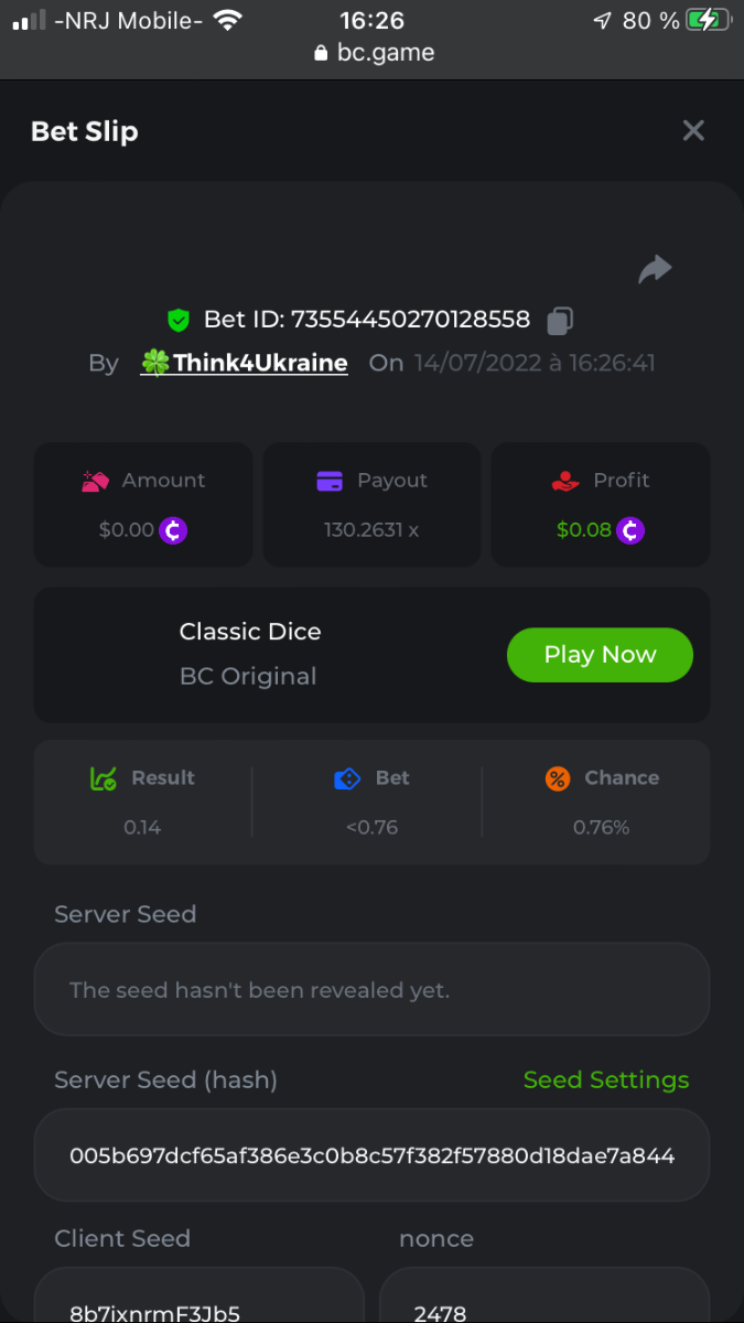 Member AkSyEn03 Posted July 14, 2022 Member Share Posted July 14, 2022 Challenge DICE Quoi de mieux pour finir la semaine qu'avec un challenge Dice classic de 48H ?Début 14/07/2022 a 16h fin le 16/07/2022 16h atteindre autant de multiplicateurs que possible dans la liste suivante... x7 X10 X13 X15 X20 X50 X70 X100 X130 X150 X200minimun pour etre qualifier> 3points Chaque pari correct comptera pour un point, les joueurs avec le plus de points seront les gagnants. si le nombre de joueurs augment le prix aussi !! Récompenses1ère place... 10BCD 2ème place... 7BCD 3ème place... 4BCD Règles :Ne publiez pas d'anciens paris Vous devez gagner le pari Vous ne pouvez gagner qu'une seule place Si vous enfreignez l'une des règles, votre pari sera annulé. Vous ne pouvez pas enregistrer les paris pour la fin, dès qu'ils sont corrects, ils doivent les partager.conditions mise minimum > 0.0001$ et jb interdis Il n'y a pas de niveau minimum Être de la chambre Française Vous ne devez avoir qu'un seul commentaire. Si vous souhaitez ajouter plus de paris, modifiez simplement le commentaire et ajoutez-les. En cas d'égalité, le joueur qui devine le pari en premier gagne. Comment entrer Accédez au jeu pour sélectionner votre ID de pari, cliquez sur l'icône Partager (↷) puis sur Copier le lien. Revenez au fil de discussion, collez le lien dans le champ "Répondre à ce sujet..." Par exemple : https://bc.game/sd/?sd=10IKIK3BP5T4PF Dans le même message, téléchargez une capture d'écran de votre victoire en cliquant sur l'ID de jeu AVEC le mode AFFICHAGE EN USD ACTIVÉ (accessible en bas du menu déroulant de votre portefeuille en haut) et Soumettre une réponse. Prêt! De cette façon, nous pouvons nous assurer que votre pari répondait à l'exigence minimale au moment de le placer : ❤ bonne chance a tous❤ Link to comment Share on other sites More sharing options...