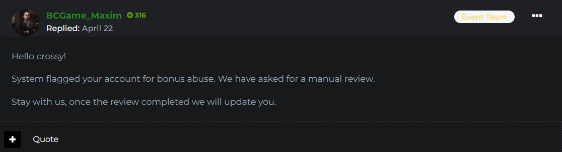 It's been over 5 months since I was denied my 100$ sports guranteed cashback #23 and I was told by @BCGame_Maxim that my account is under review. I kept asking for updates but they haven't given a single explanation as to why. Since then my bonus of sports guranteed cashback #35 is also pending and I had also participated in Double prize for coin flip hunt for 126x the event code was b014a8ae582c2e6. I am yet to be credited these 3 bonuses and I get no reply from the bc team even after various mails and messages to forum mods and live support. This is really messed up for a casino this big. I request bc to complete this as soon as possible, I cant wait for 5 more months