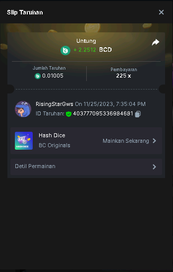 Moderator Giandreas Posted November 25, 2023 Moderator Share Posted November 25, 2023 Read Carefully Before Start To Hunt Forum Daily Challenges #429Hunt : Hashdice Win the highest pay out Min Payout : 50x Min Level 4 ️Duration Starting : Now End time : 23.59 UTC Time How to Join? Make screenshot + paste your bet link + UID or Profile link Any coin, with min bet 0.01 USD is allowed (jb/bb/bcl not allowed) Reward Prizes 1st Place.....$7 BCD 2nd Place.....$5 BCD 3rd Place.....$4 BCD 4th Place.....$3 BCD 5th Place.....$2 BCD 🏵 Winners will be announcing next day after Roll Point! Link to comment Share on other sites More sharing options...