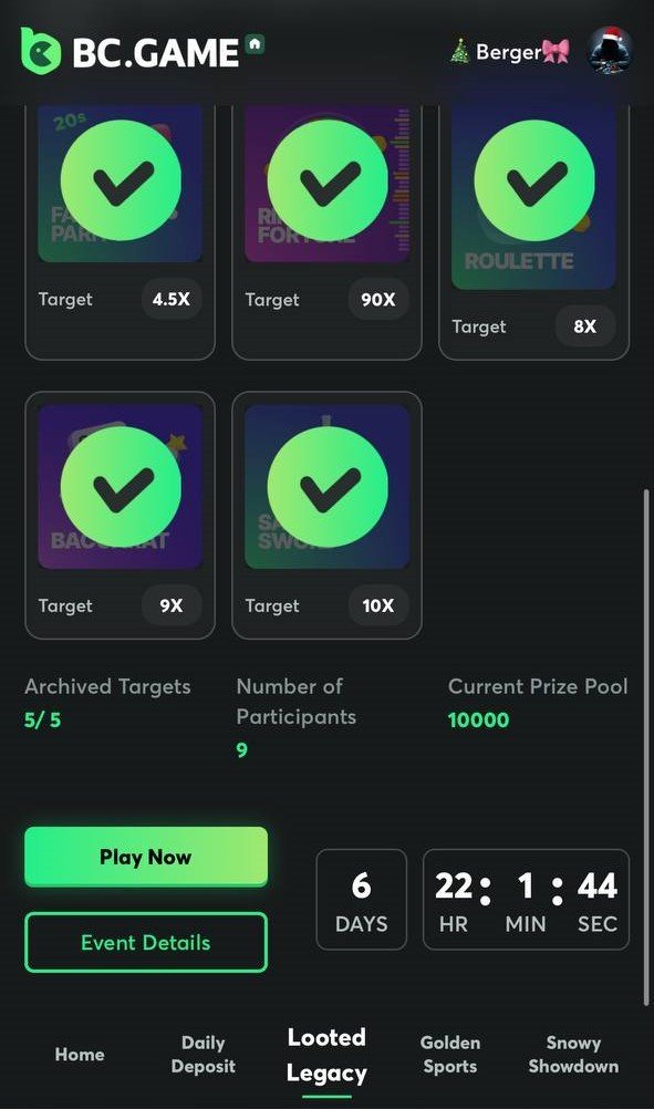 Berger Posted January 8 Author Share Posted January 8 On 1/6/2025 at 4:20 PM, Mary_bcgame said: To be on the top 10 list (additional $1000 bonus), you have to take part in all looted legacy challenges, from week 1,2,3 and for week 4 you have to be in the top 10 in completing all missions, I hope you understand that Could you tell me in what time the last of the top 10 made his last quest? So, betlink will be much better Link to comment Share on other sites More sharing options...