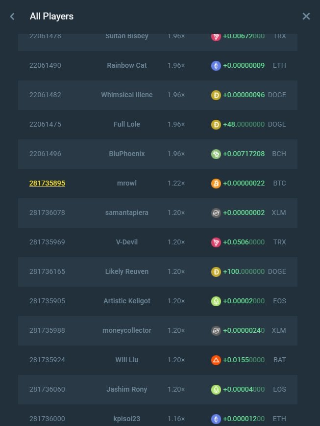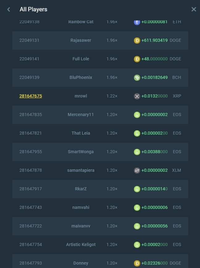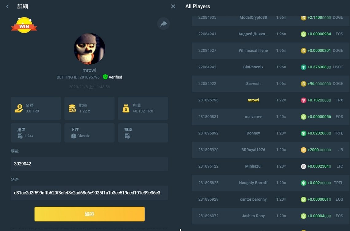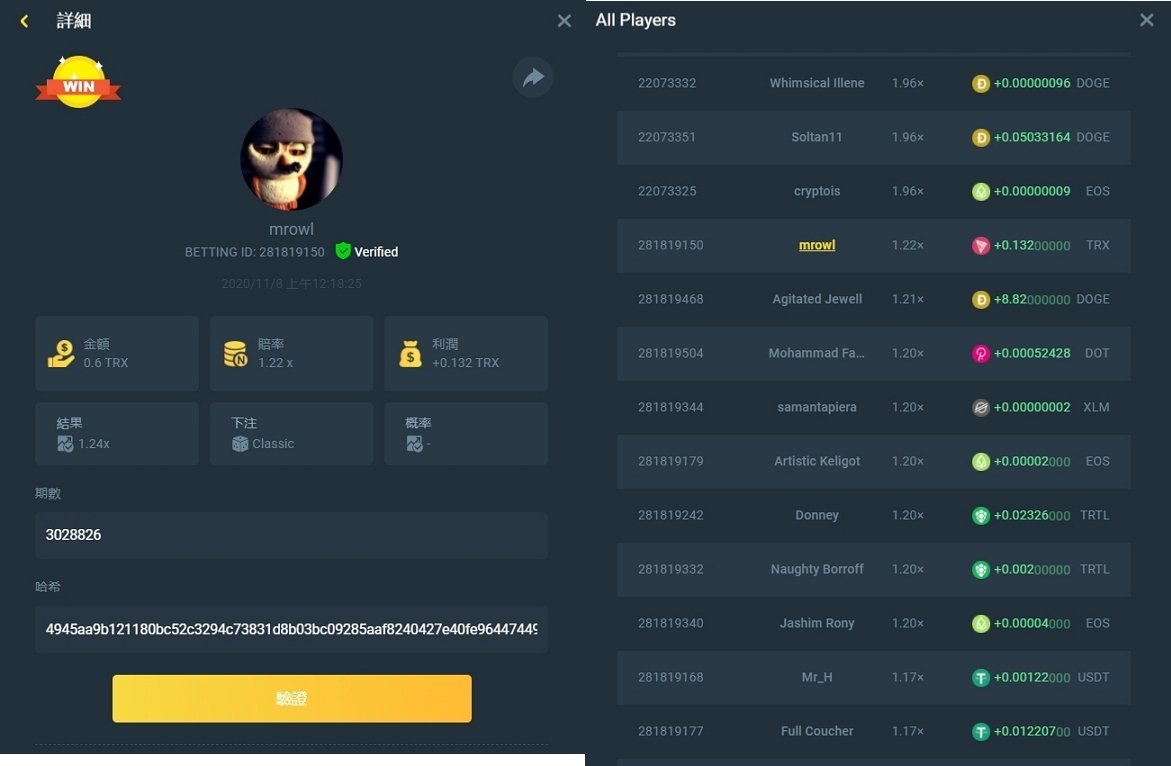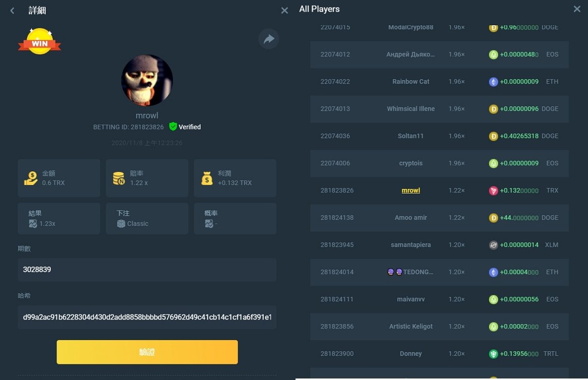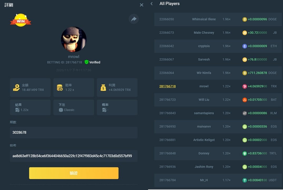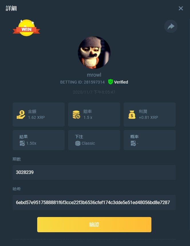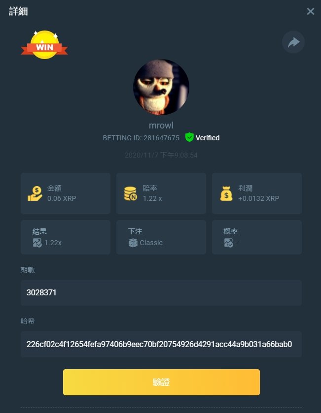 真是的 Posted November 6, 2020 Share Posted November 6, 2020 時間:台北時間 2020/11/7 20:00 ~ 2020/11/8 20:00。 參加資格:玩家需活躍於中文聊天室、並且是大家熟知的中文玩家。(突然冒出來沒人認識的帳號、或長期不參與中文聊天的帳號皆不符資格)。 挑戰遊戲:爆點 (classic)。 最低下注金額:請參考下表,僅限使用表定的幣種、金額不得低於表定的數量。 挑戰目標:下注金額依照上表規定,挑戰成為最後一名成功逃跑的幸運兒 (包含與其它玩家並列最後同時成功逃跑者),並且你的逃跑倍數不得高於 5x (含)。參與挑戰並達成目標者、需在下方回覆此討論串、粘貼螢幕截圖、並提供該局 Game-ID 才算是完成整個任務。 達標獎金:每一次達標得獎金 0.00035 ETH,玩家可以重覆多次挑戰、獎金可累計。 名額:不限名額。此活動總獎金 0.1 ETH、依玩家回覆文章順序統計發放、發完為止。若有剩餘獎金、將留待以後活動使用 獎金發放:將於活動結束後統計並確認資料無誤以後發放獎金。 以上活動訊息如有缺漏將於討論串當中隨時補充更新、請密切關注。 Link to comment Share on other sites More sharing options...