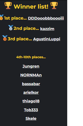 bassabar Posted February 26, 2022 Share Posted February 26, 2022 (edited) Hi @Vlkyrie,. thanks for the new flashchallenge. Can you check the previous challenge? Because I received a price as 6th, while I was placed 2th (I was the only one with 9 points, and only DDDooobbboooiii had 10 points) all others had 8 points or less). So @s0urcemiscalculated with this results: Edited February 26, 2022 by bassabar 2 Link to comment Share on other sites More sharing options...