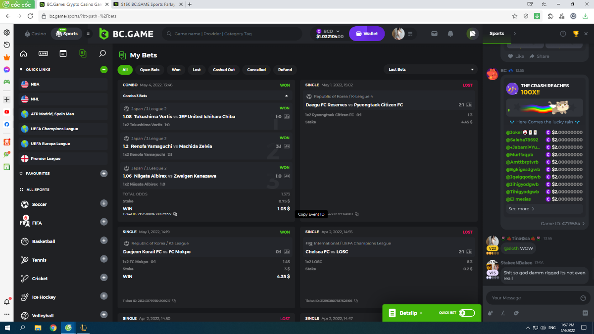 Moderator Mat Posted May 1, 2022 Moderator Share Posted May 1, 2022 BC.GAME SPORTS PARLAY CHALLANGE #3 Start: 1, May 13:00pm GMT Ends: 8, May 23:59 GMT Welcome to BC.GAME SPORTS PARLAY CHALLENGE with a prize pool of $150! Check below the full terms and conditions and how you can win these rewards! What is the challenge? Place a Sports Parlay/Combo Bet to qualify for the challenge. A parlay consists of two or more sports bet in a single slip with higher multiplier. Highest parlay multiplier wins the challenge. Visit https://bc.game/sports to make your parlay selections. Minimum VIP No Minimum VIP Level Minimum payout There is no minimum multiplier, however, only the top 10 winning parlay multipliers will win a prize! Minimum Bet Size $0.25 USD equivalent Eligible Coins All cryptocurrencies are eligible (excepting JB, and BCL) Available Prizes 1st Place....... $502nd Place..... $303rd Place...... $254th Place......$155th Place......$10 6th-10th.........$5 How to Enter: To participate, copy the Betslip Ticket ID of your parlay and post it as a reply to this thread as follows: Ticket ID: 2126602890796736992 Along with the screenshot of your parlay slip. Ticket ID: 2126602890796736992 If a selection results in a void or push, the bet will remain eligible as long as it remains equal to or greater than a triple bet and meets the odds requirements. Cashed out bets will not be counted. Please combine all of your hits together in a SINGLE post. Edit your existing post for additional hits, don't create a new post. Bets must be made during the specified time window stated above. This thread will lock automatically when the time period is over. One (1) entry per family. If someone finds multiple prizes, they will be disqualified from the challenge, as well as from all future challenges. Failure to comply with the instructions will result in your submission being void. By entering this challenge, you acknowledge that BC.Game has final decision rights over results and placement. All prizes will be paid out in BCD within 72 hours of completing the challenge. Link to comment Share on other sites More sharing options...